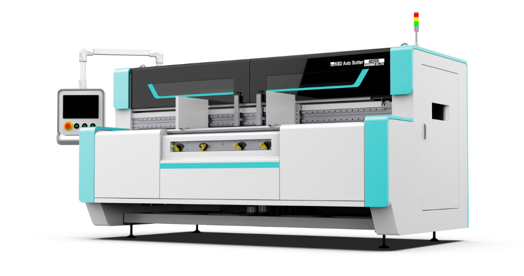 オンデマンド段ボール加工機「KBD AUTO SLOTTER AB2500」は、段ボール製函に必要な複数工程を1台で自動処理し、各種特許取得した構造設計のもと、ワンパスで連続生産することができます。